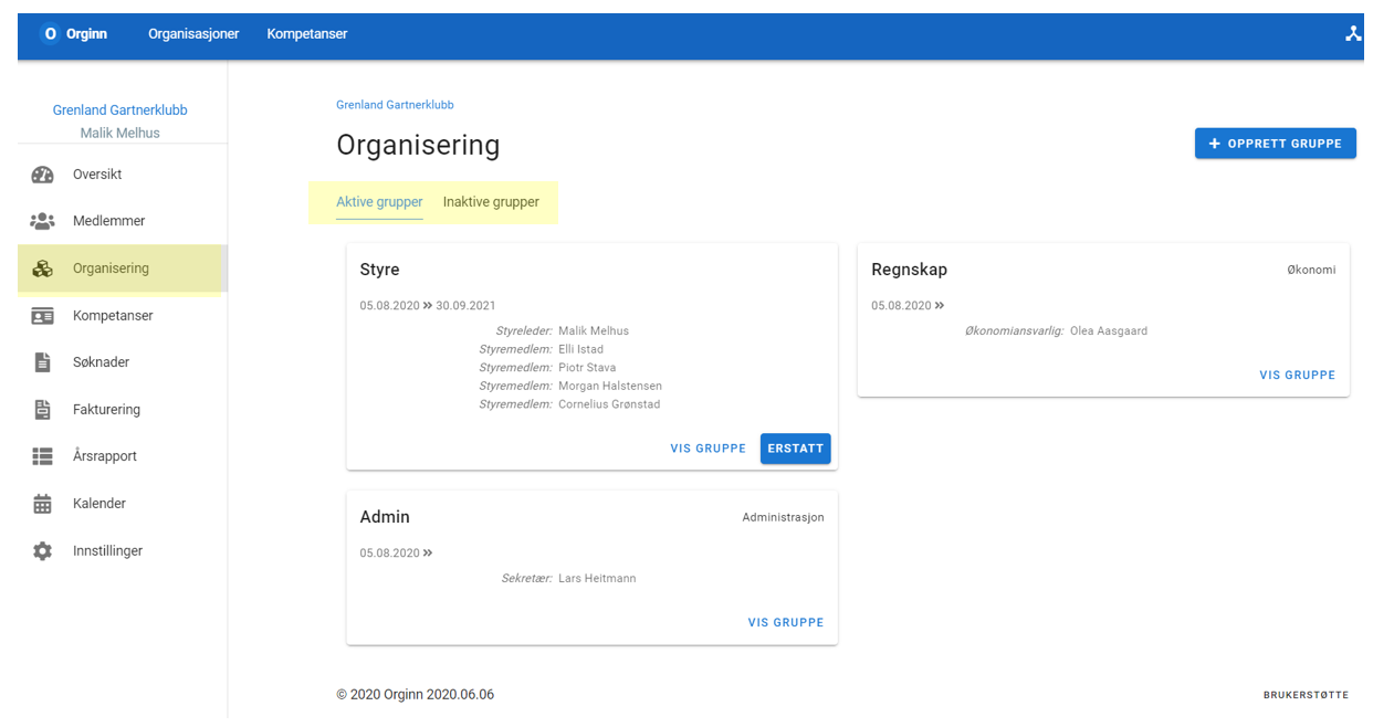 På Organisering finner du aktive og inaktive grupper, se markert i gult på dette bildet: