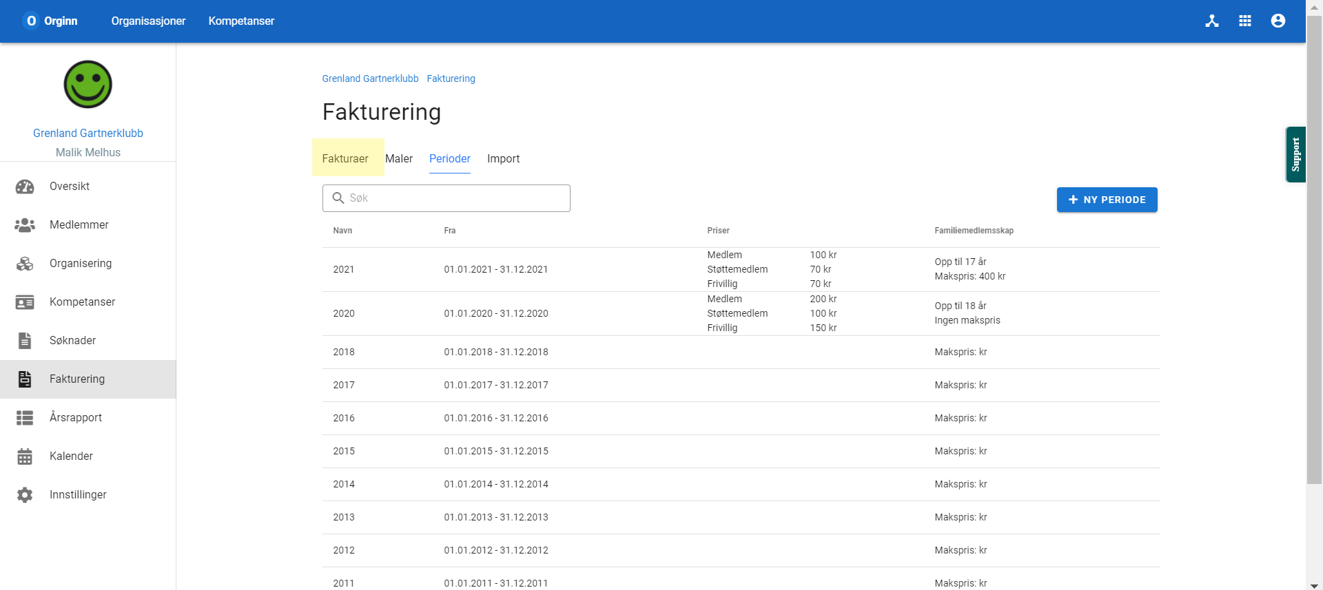 I perioden definerer du hvilken periode kontingenten skal gjelde for, og pris på kontingenten for denne perioden. Her definerer du også hvem som inngår i en eventuell familierabatt. I malen velger du tittel og tekst på faktura, forfallsdato og bankkonto