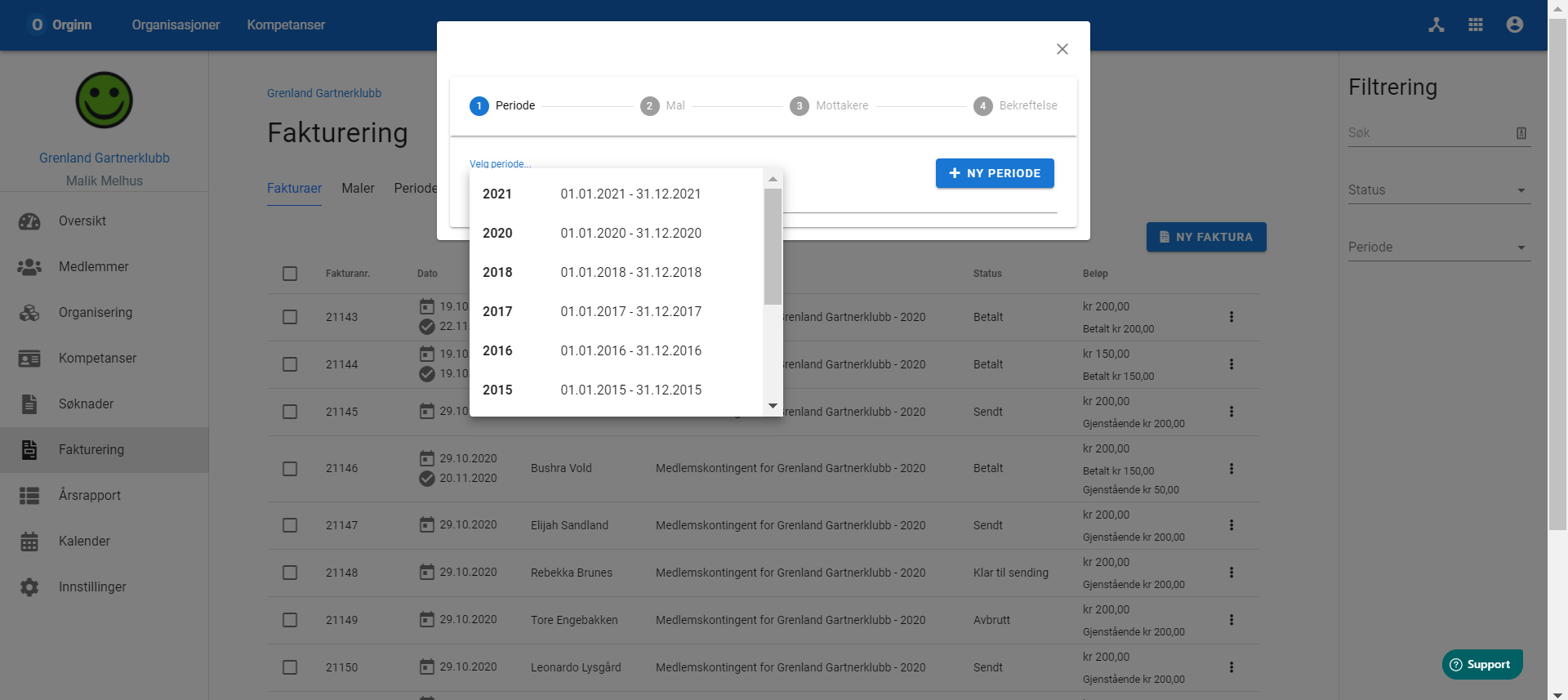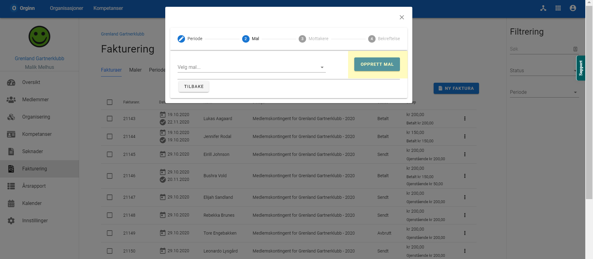 Greit å vite: Orginn oppretter maks én faktura per mottaker per periode. Dette er for å unngå at personen skal få flere kontingent-fakturaer for samme periode, hvis du fakturerer i flere omganger.