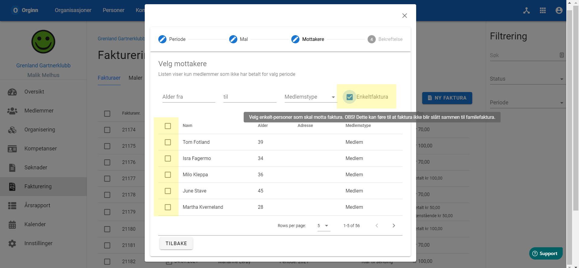 For å velge enkeltmedlemmer, huk av "Enkeltfaktura", og huk av de personene du ønsker å fakturere