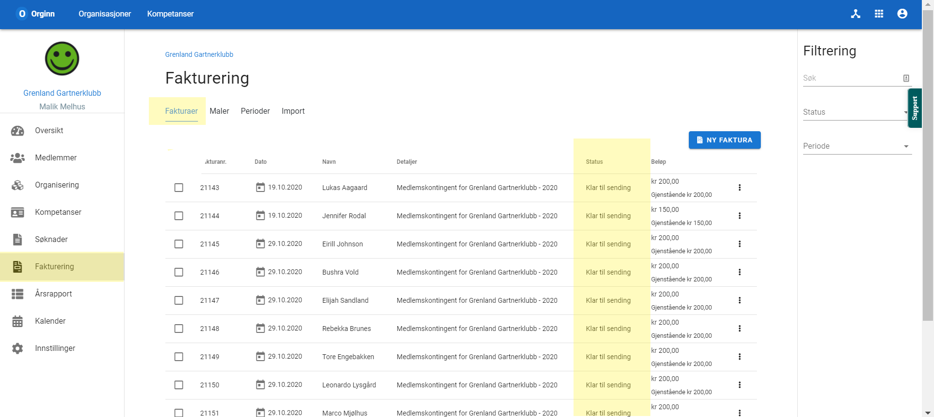 Når du har opprettet fakturaer vil disse vises under Fakturaer, med status Klar til sending