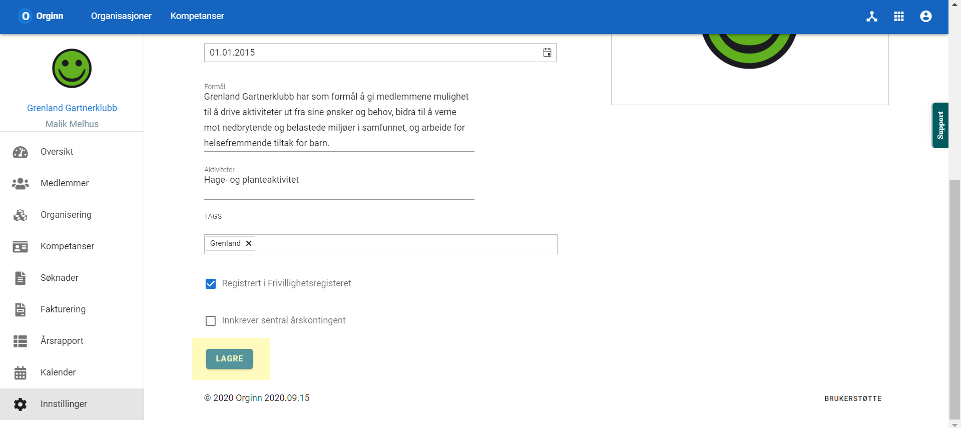 Foreningens navn og organisasjonsnummer finner du under Innstillinger og Generelt