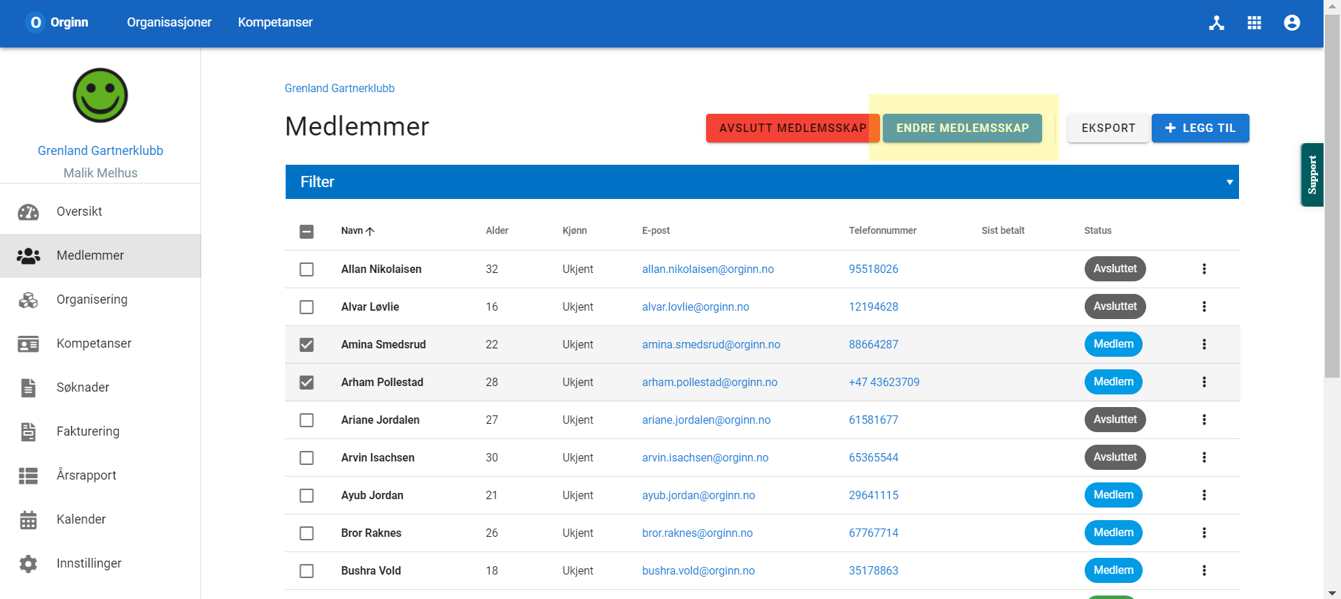 Her skal vi endre medlemskap for to personer, som er registrert med status "Medlem".