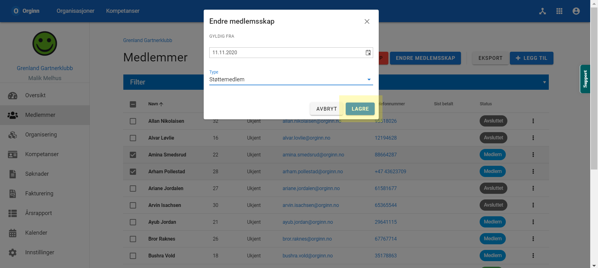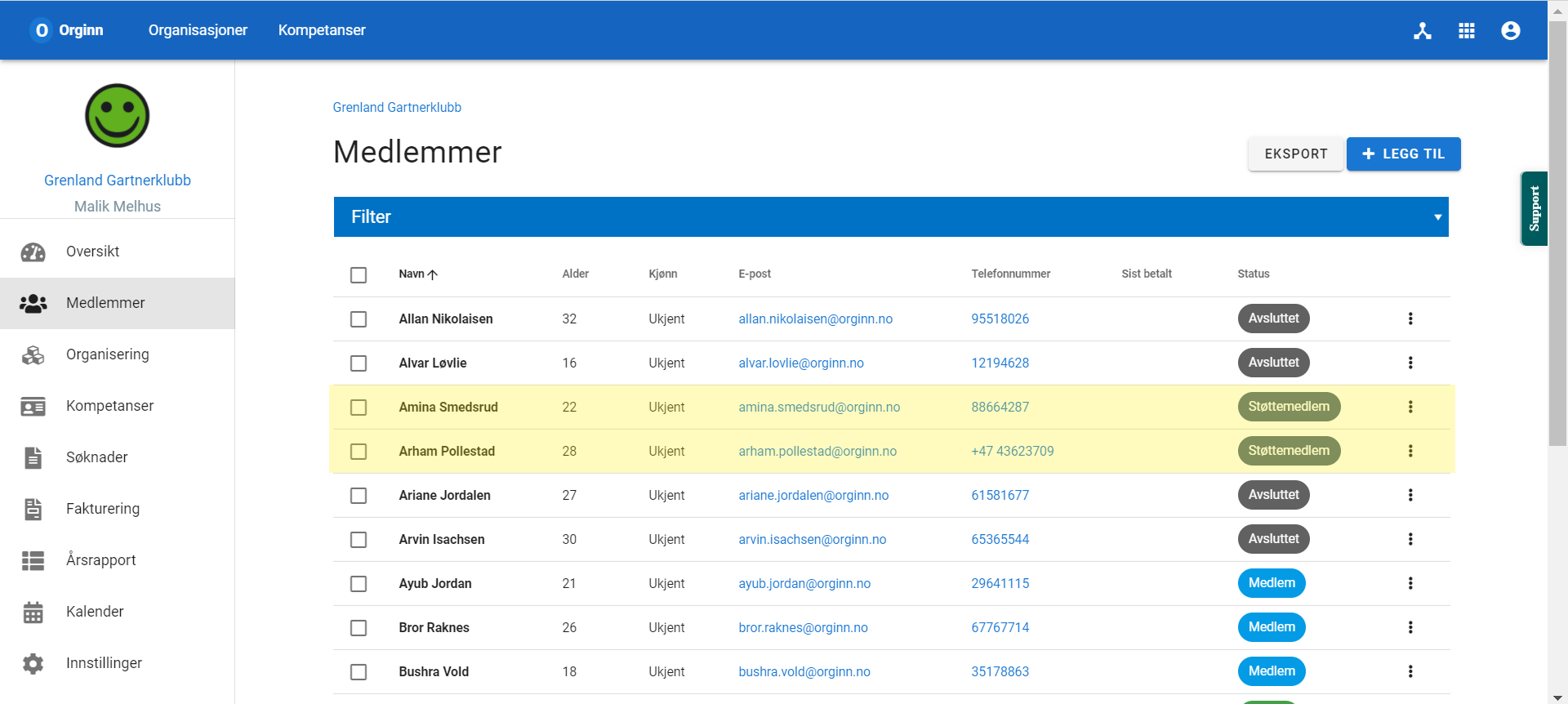 Her ser vi at personene som tidligere var registrert som "Medlem", nå har status "Støttemedlem".